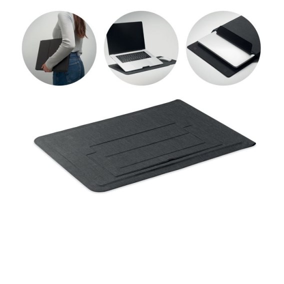 Pokrowiec na laptopa 16 cali z RPET z podstawką na laptopa i podkładką pod mysz po rozłożeniu.
