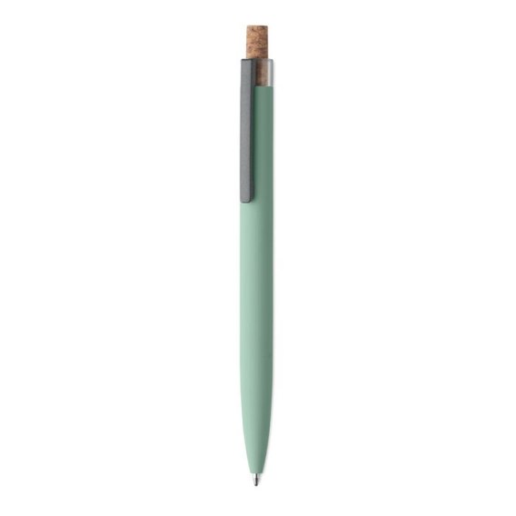 Długopis z aluminium pochodzącego z recyklingu z korkowym przyciskiem i metalowym klipem. Niebieski tusz.