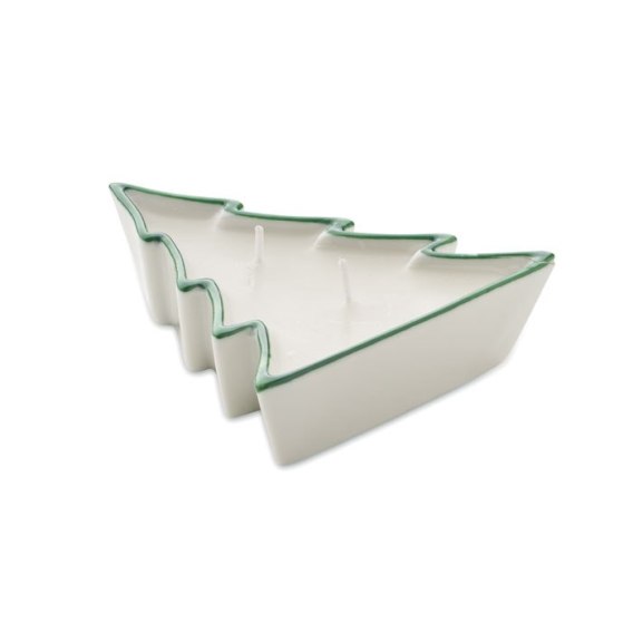 Świeca na bazie wosku roślinnego w porcelanowym pojemniku w kształcie choinki z 2 knotami. 60 gr. Czas palenia: 4 godziny.
