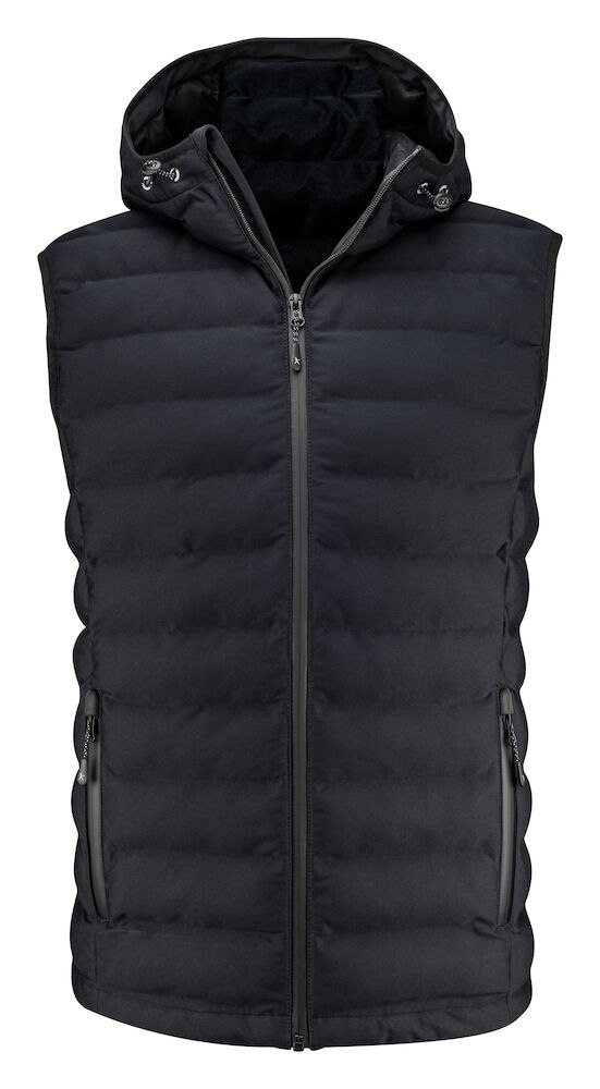 Bezrękawnik zimowy pikowany. Wodoodpory suwak na środku z przodu oraz w kieszeniach bocznych. Kieszenie boczne wykończone razem ze szwem bezrękawnika od wewnątrz, mogą również pełnić funkcję kieszeni wewnętrznych. Kaptur regulowany za pomocą elastycznych sznurków po bokach, wykończony elastyczną taśmą przy szwie.